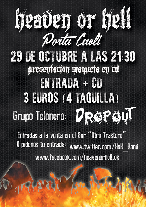Este joven grupo vallisoletano actuará por primera en la Sala Porta Caeli de Valladolid, este 29 de Octubre a las 22:15h. Heaven or Hell, tras dos años de ensayos, por fin presenta su primer trabajo, una maqueta con cinco temas cargados de fuerza y distorsión, con influencias tanto de motorhead y de metallica como de cosecha propia, y lo harán acompañados por primera vez de DropOut, un grupo de Valladolid que también viene con ganas de pasar una gran noche en familia, y con todos lo que se quieran acercar por primera vez.